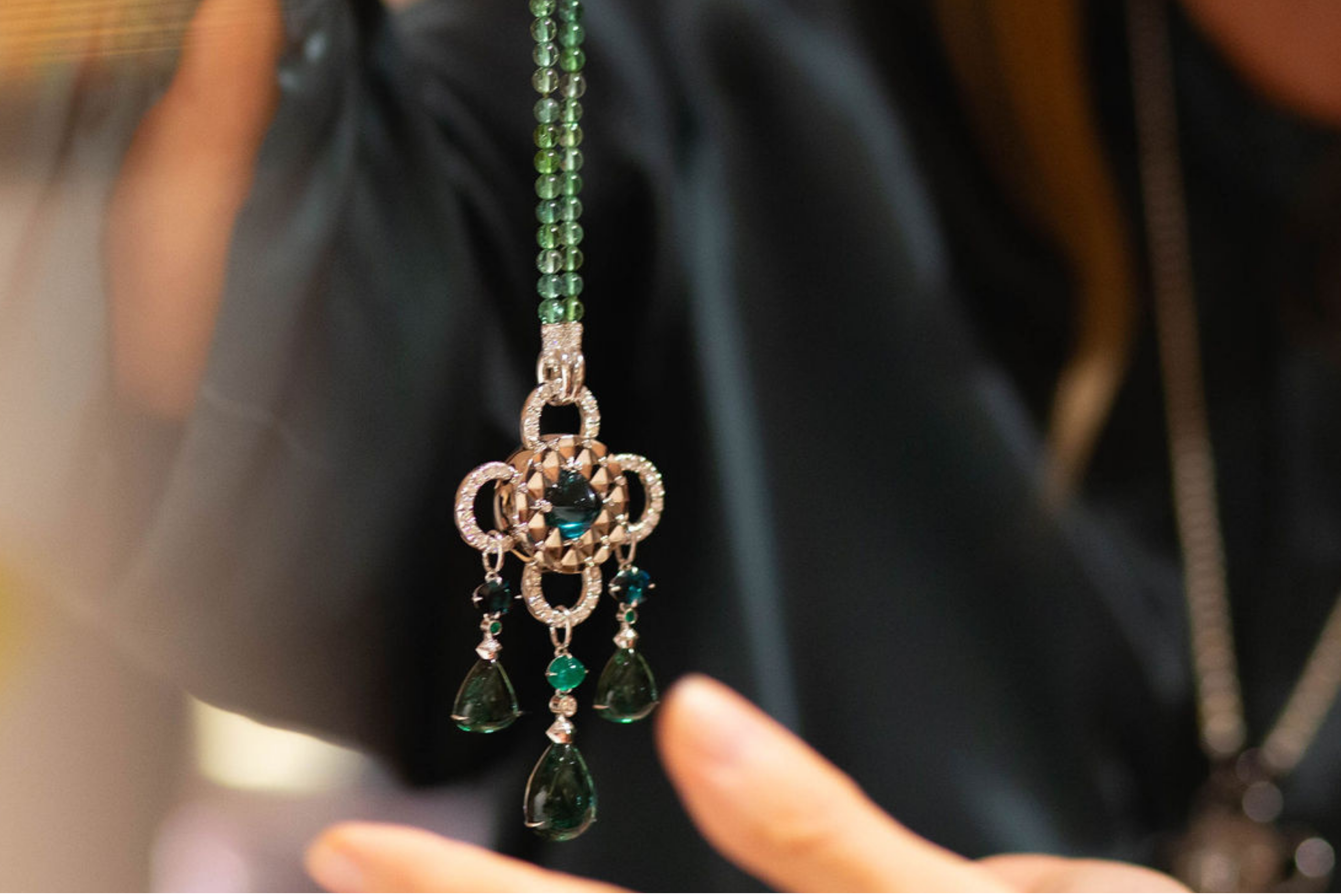 d'un cabochon d'émeraude et de tourmalines ovales. Le fermoir, pavé de diamants d'un poids de 3,94 carats, est