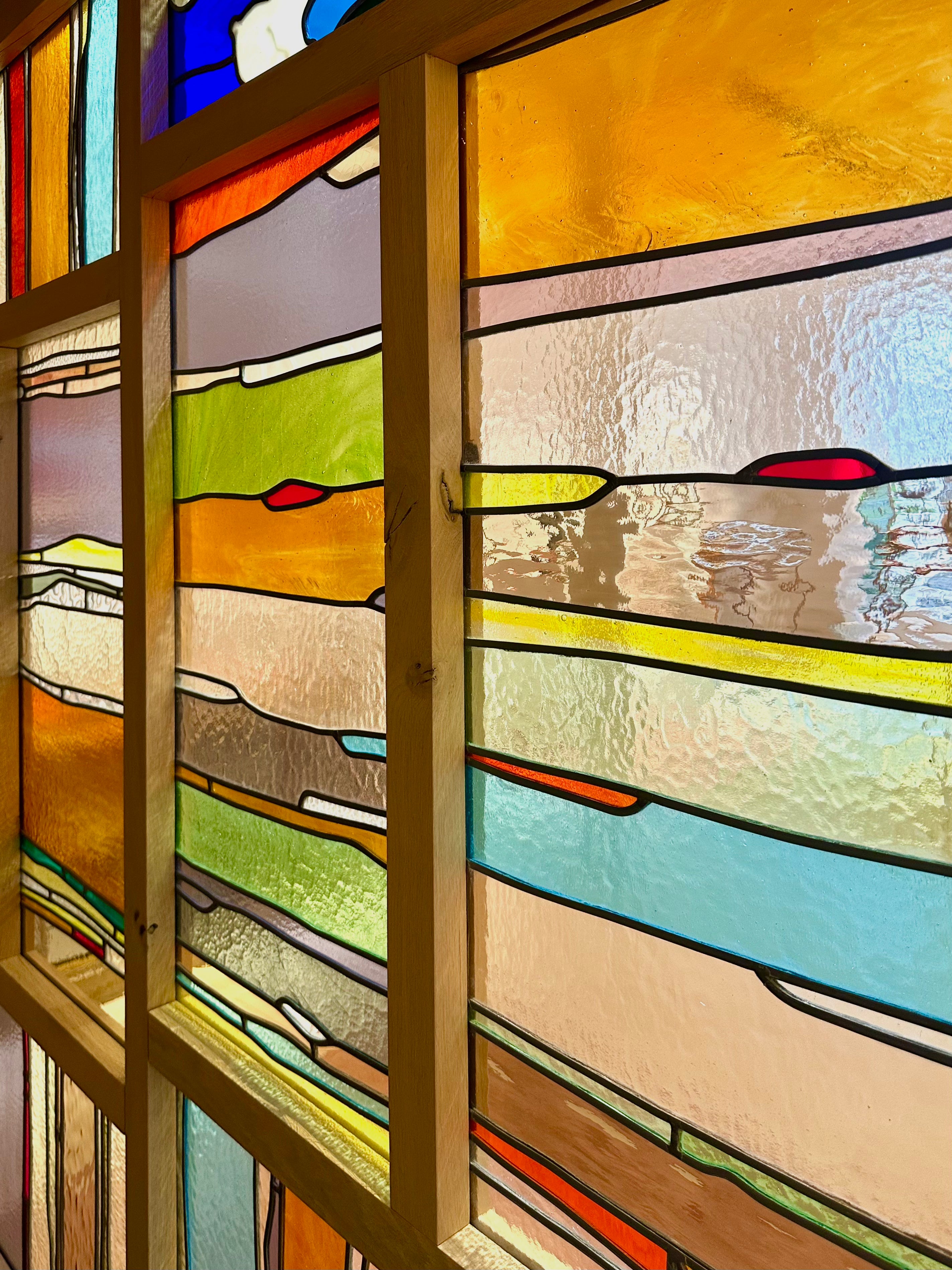 Le vitrail, créé par l'Atelier ST et ses artisans verriers talentueux, suit le dessin de Shinsuke. Ce mur de vitrail de 4m2 est composé de verre coloré provenant des chutes des artistes et de la verrerie de Saint Just. À l'intérieur de la maison de thé mobile se trouvent deux tatamis, une douce lumière sous un vitrail et un élégant tronc d'arbre. L'ambiance apaisante et colorée qui filtre à travers les vitraux crée un lieu propice à la méditation et à la détente.