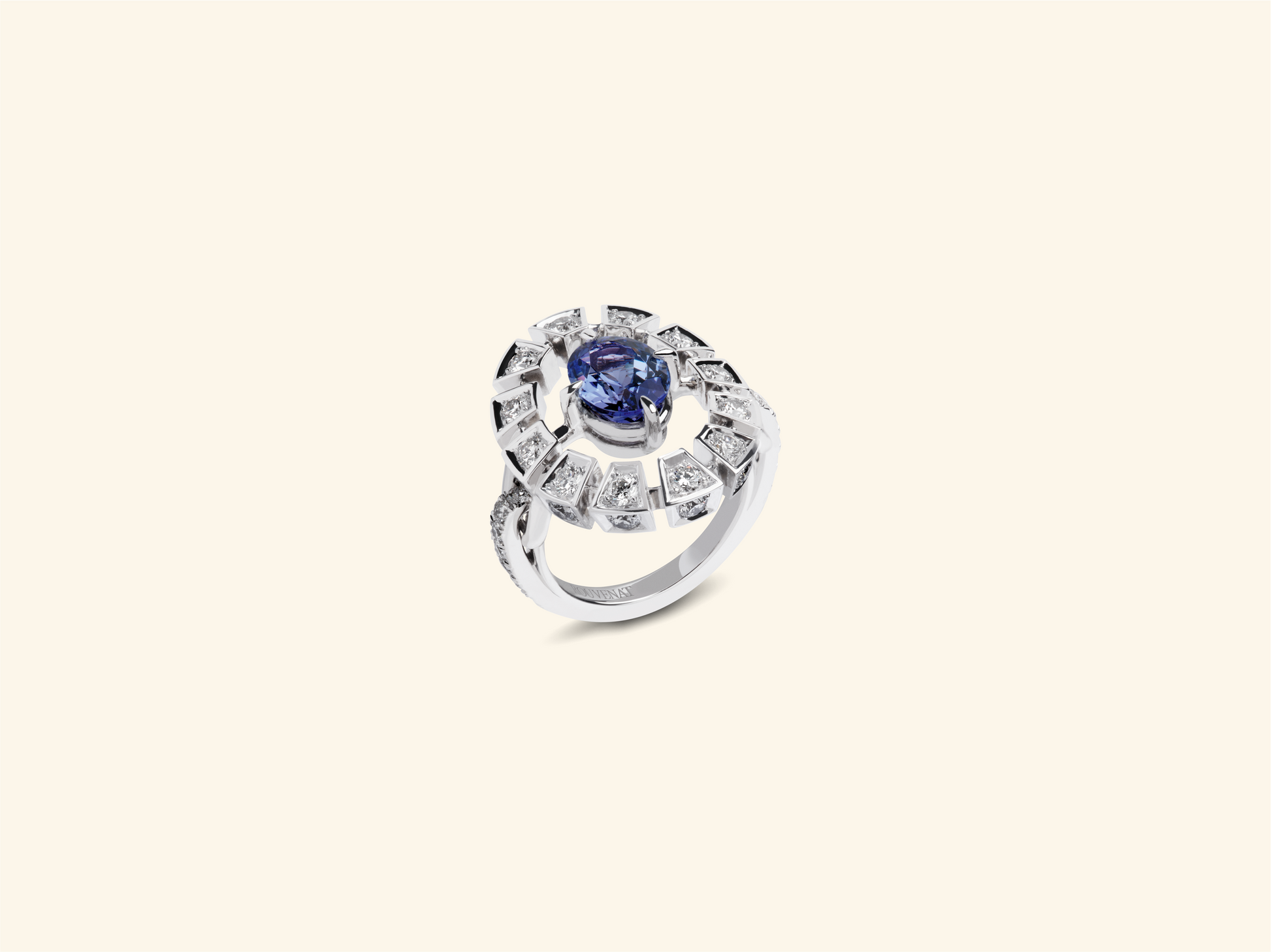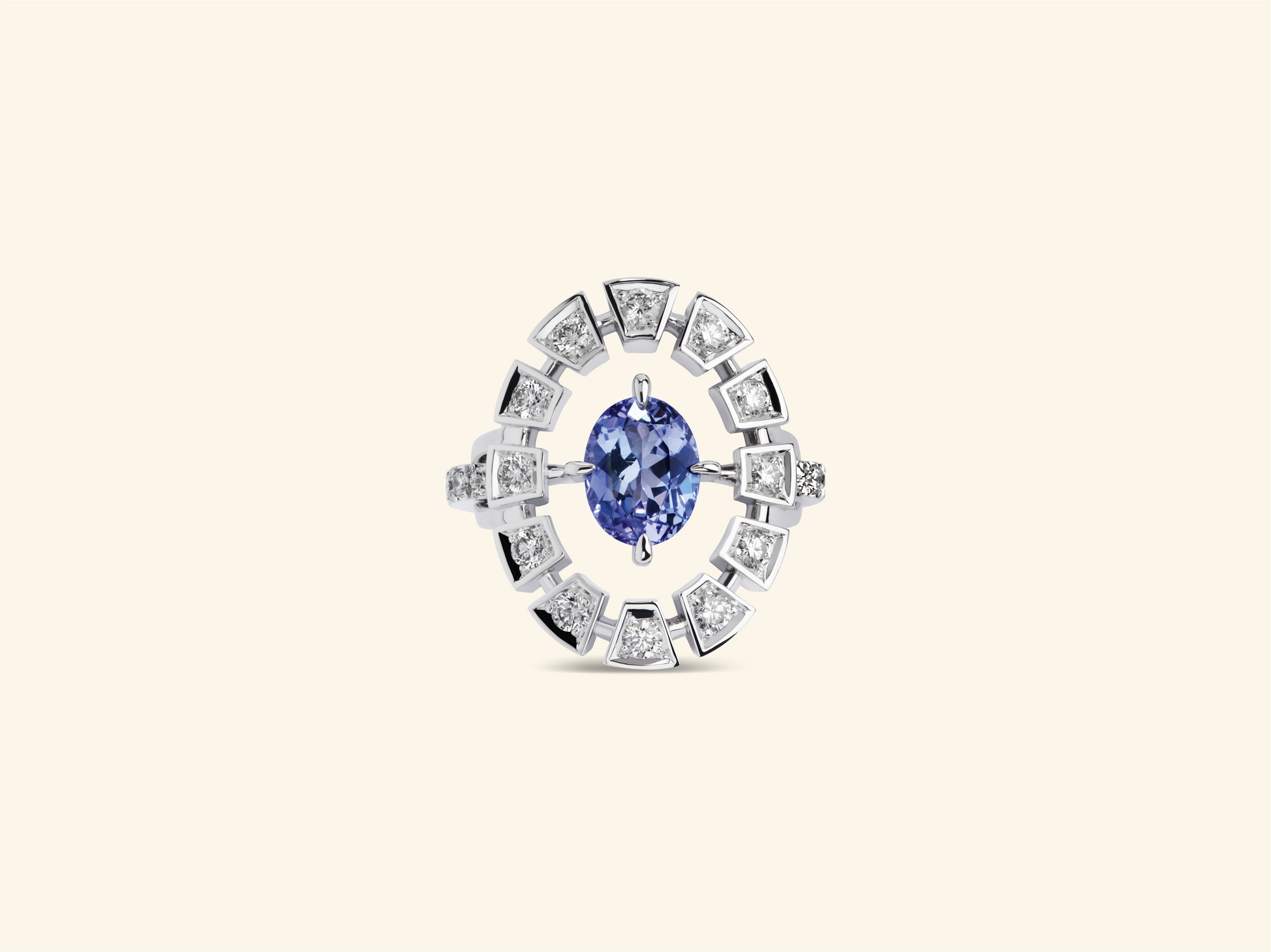 Bague Frame, or blanc 18k, sertie d'une tanzanite de 2,12 carats et de 26 diamants pour ~1,63 carats.