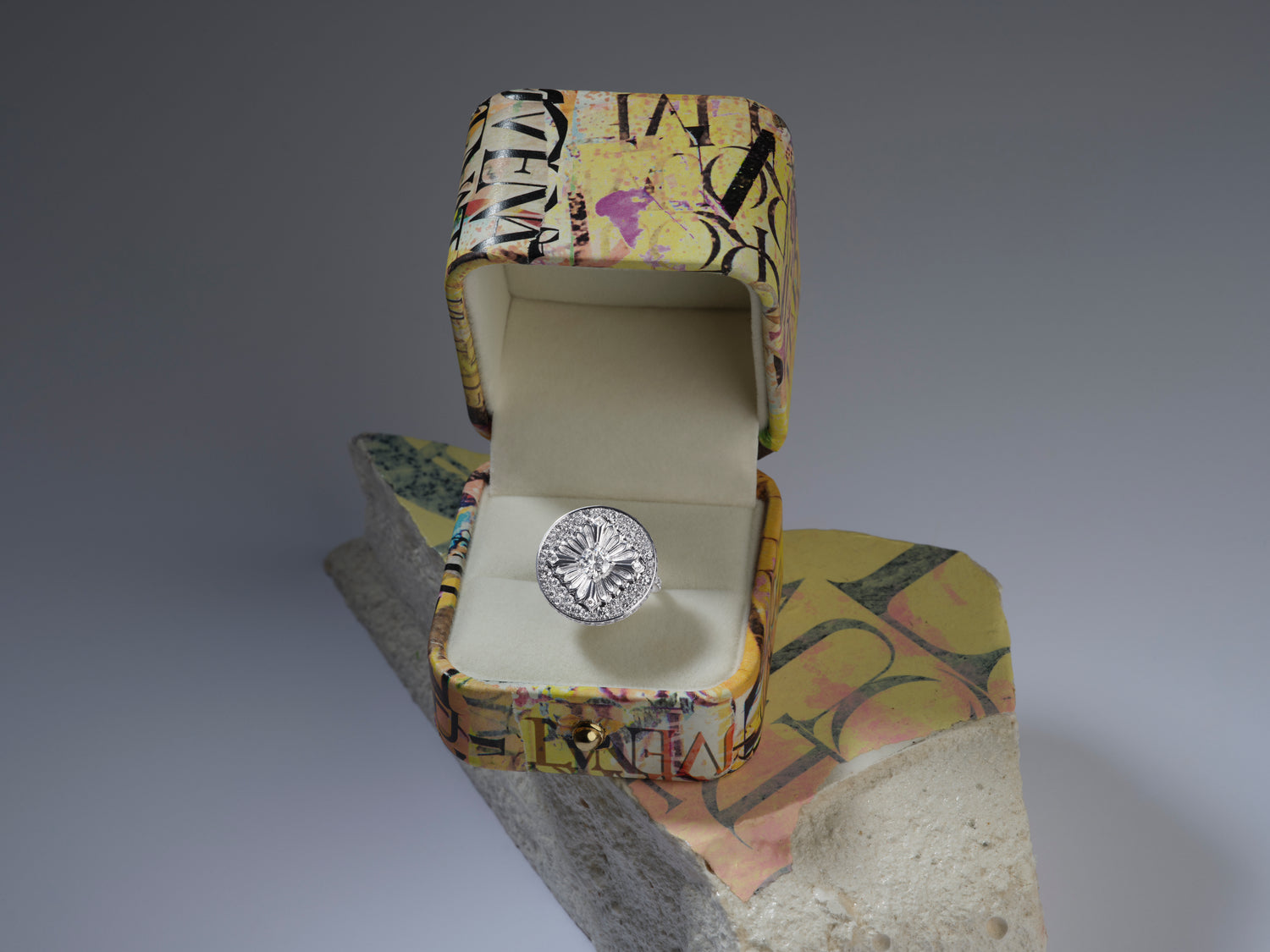 Bague Tag, or blanc 18k, sertie d'un diamant de centre de 0,55-0,60 carat et de 104 diamants pour ~1,68 carats.