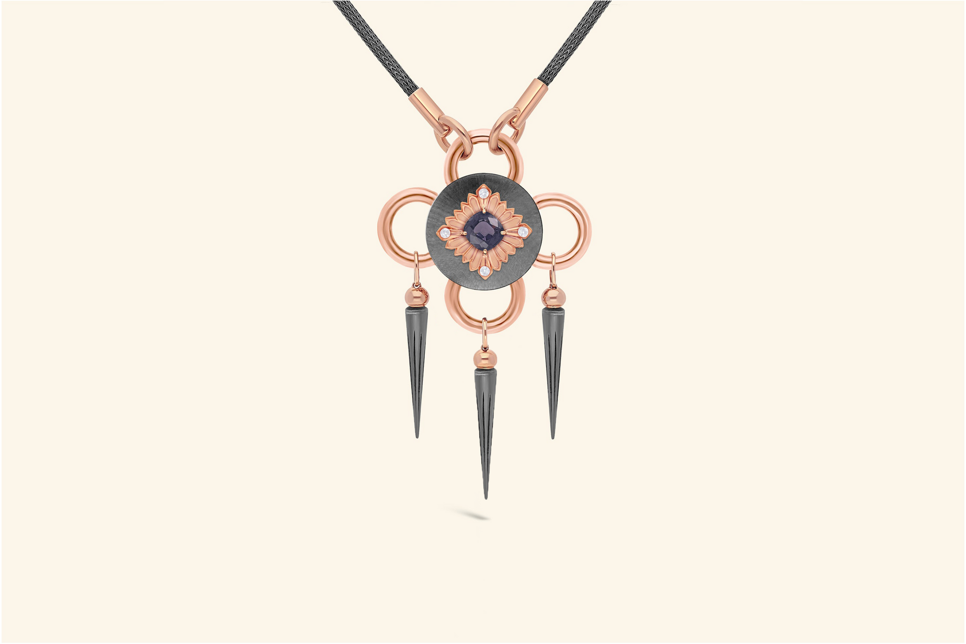 Collier Bolt, argent noirci et or rose, diamants, spinelle gris