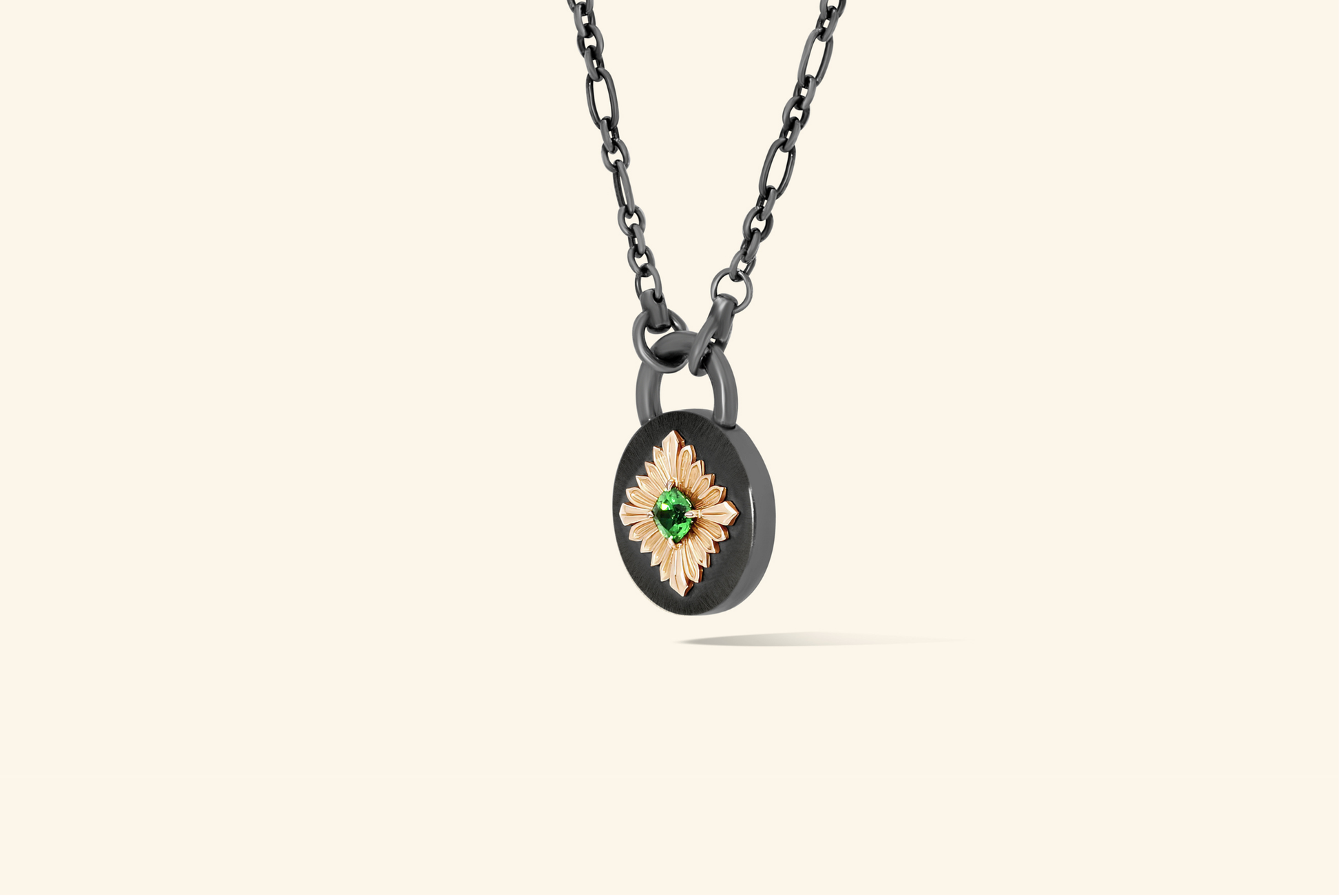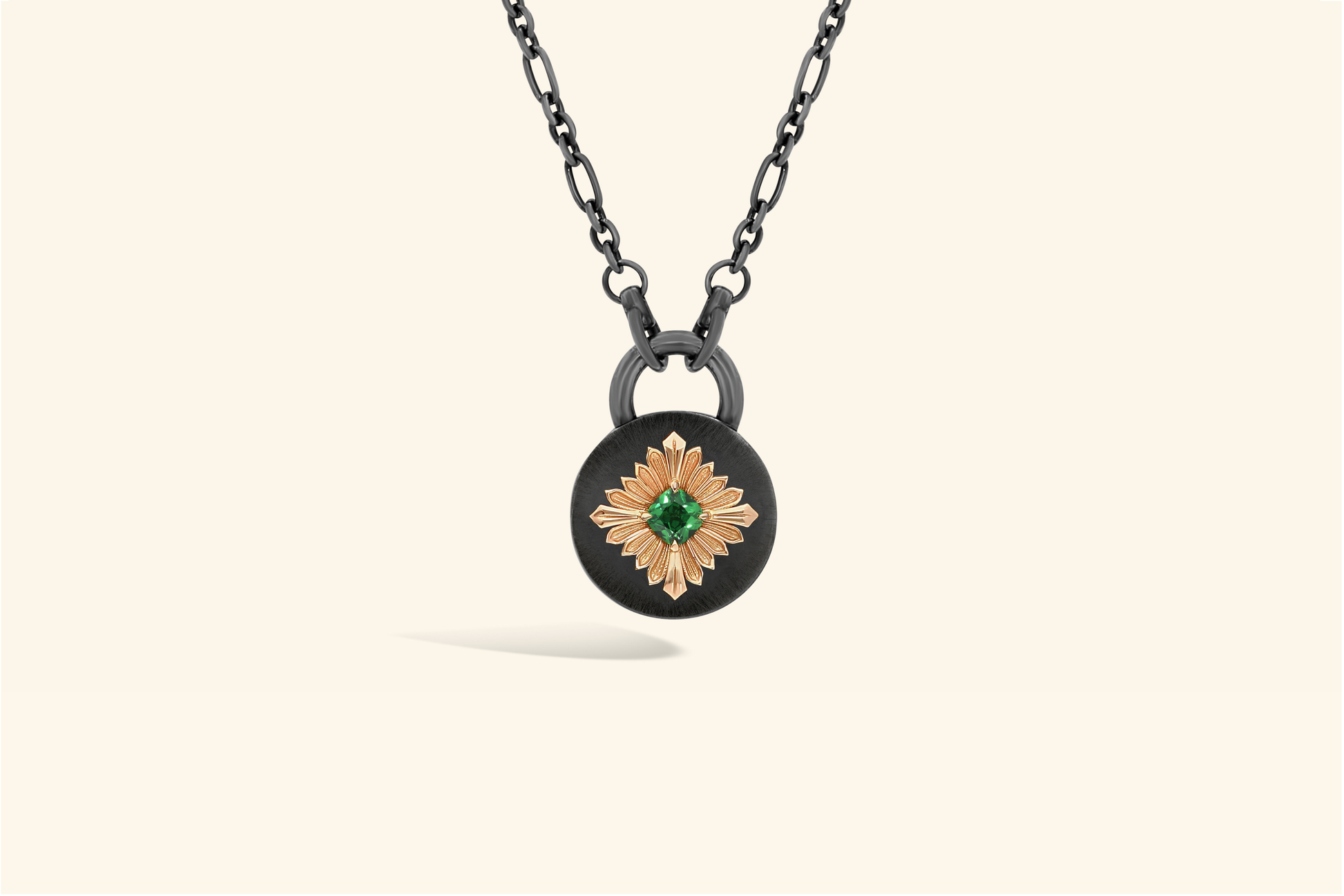 Collier Tag, argent noirci 925, or rose 18k, serti d'une tsavorite de ~0,60 carat.