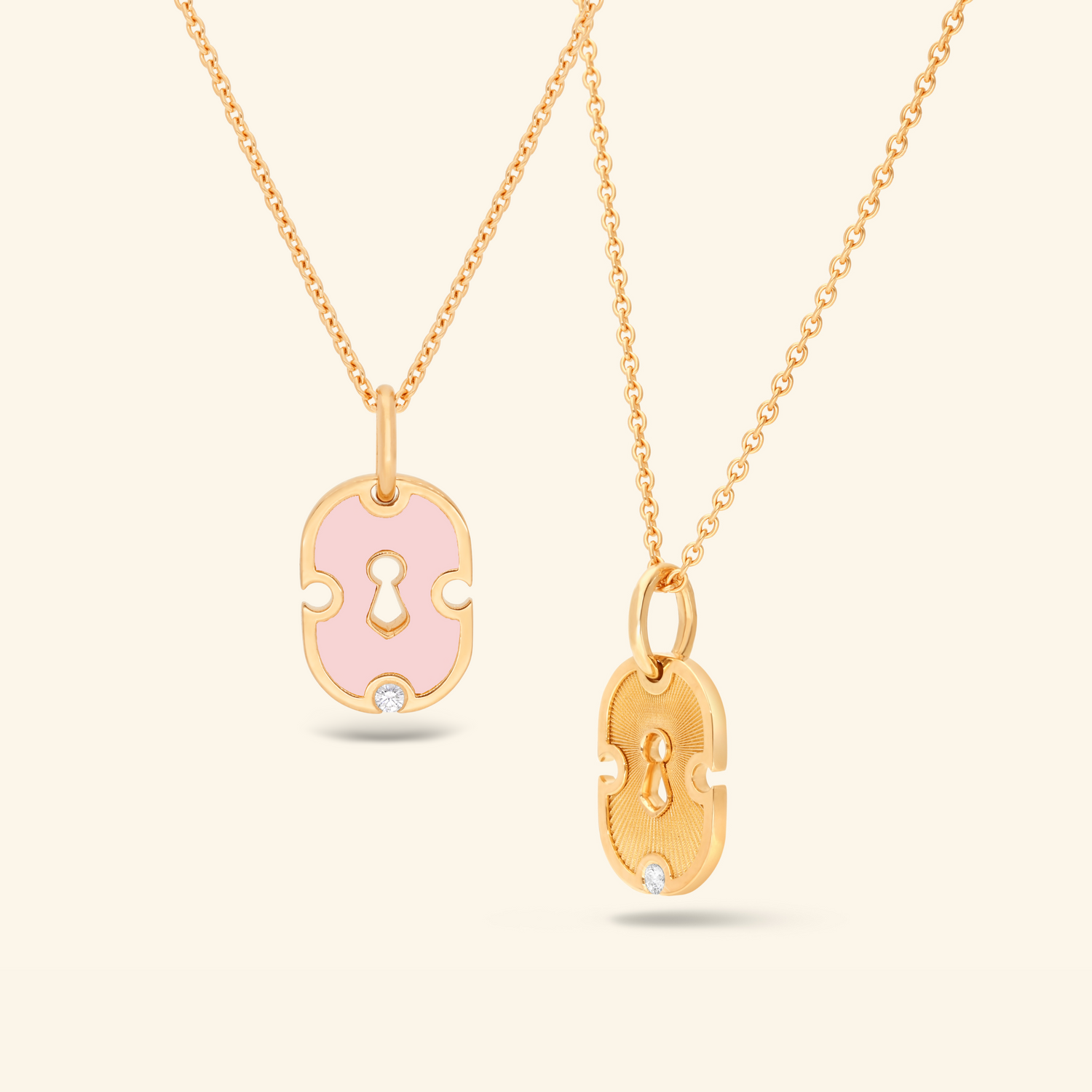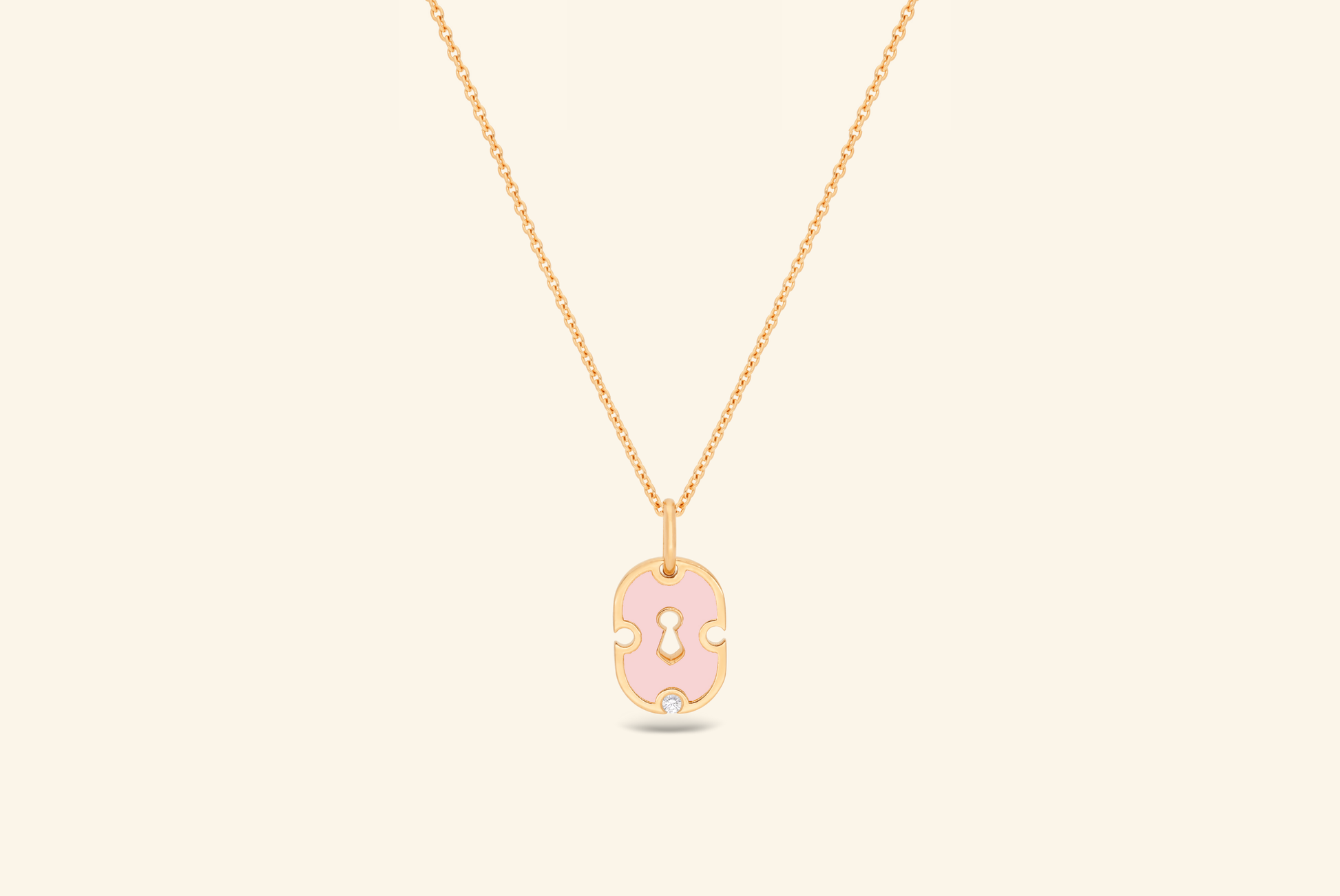 Pendentif Unlock petit modèle, or jaune 18k et céramique rose, serti d'un diamant de ~0,03 carat.