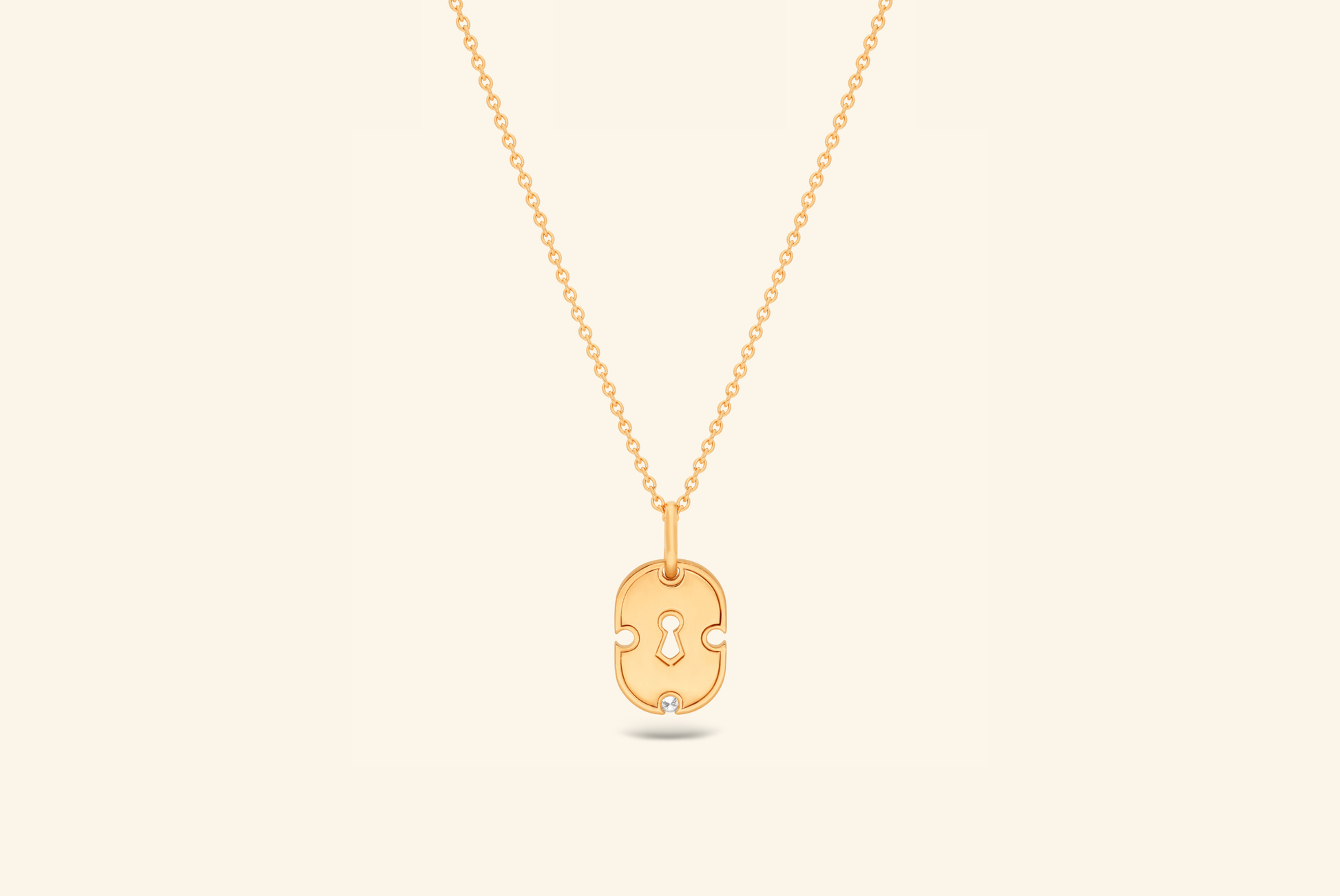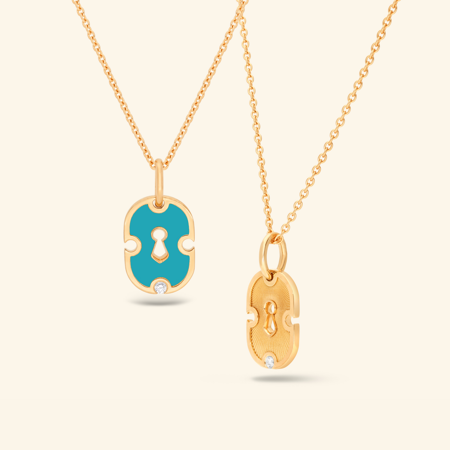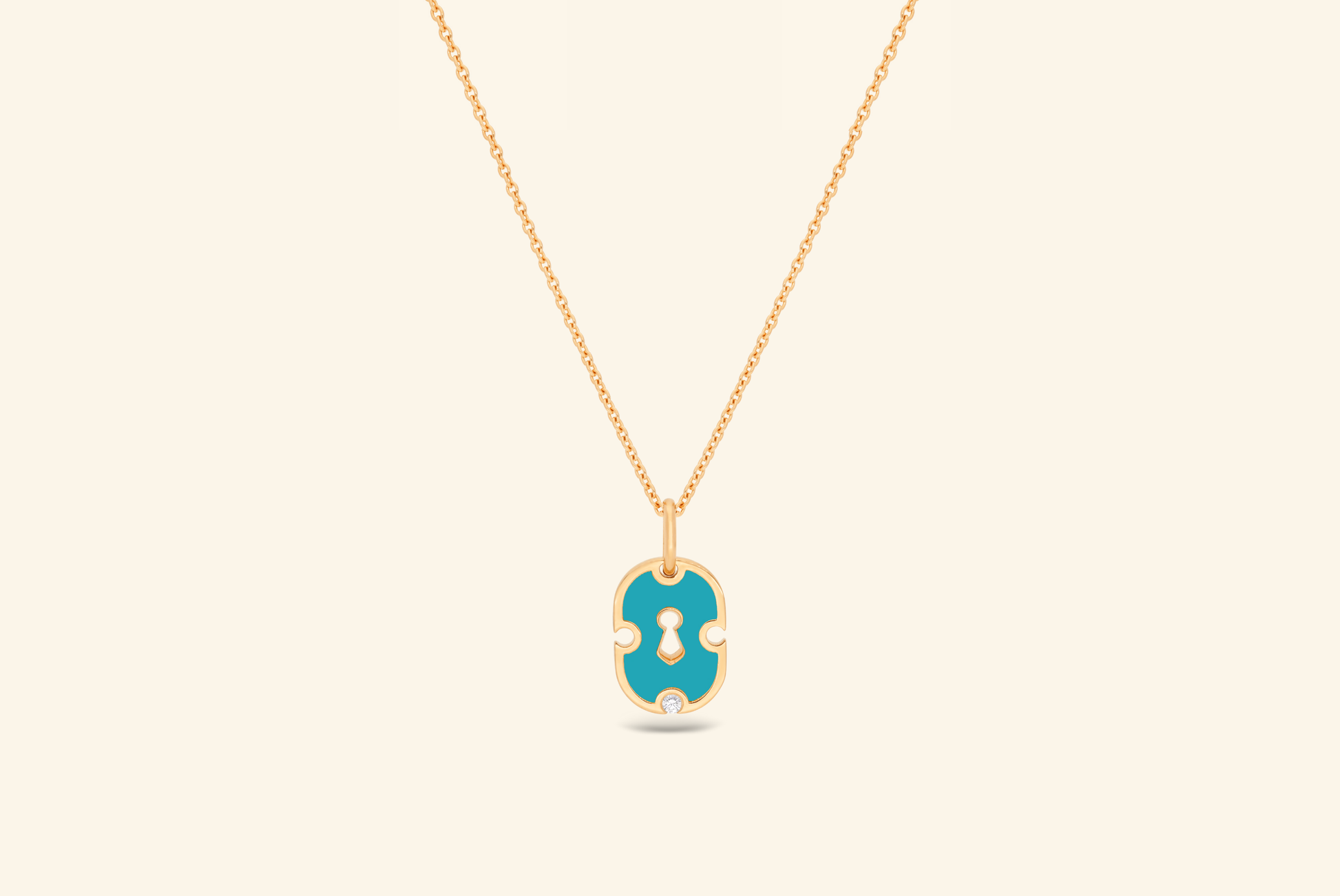 Pendentif Unlock petit modèle, or jaune 18k et céramique turquoise, serti d'un diamant de ~0,03 carat.