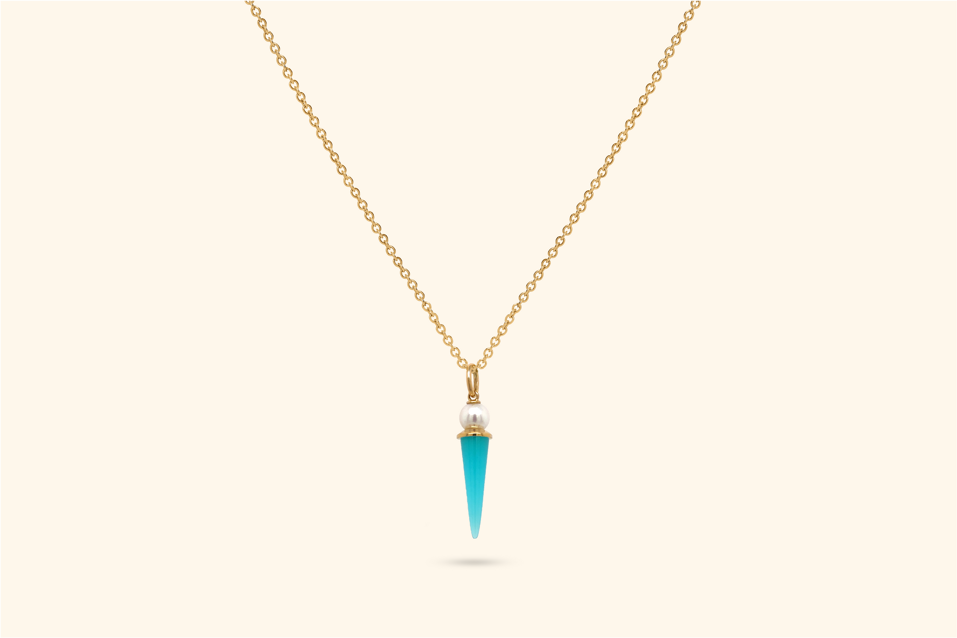 Pendentif Mini Pampille, or jaune 18k, agathe bleue surmontée d'une perle.