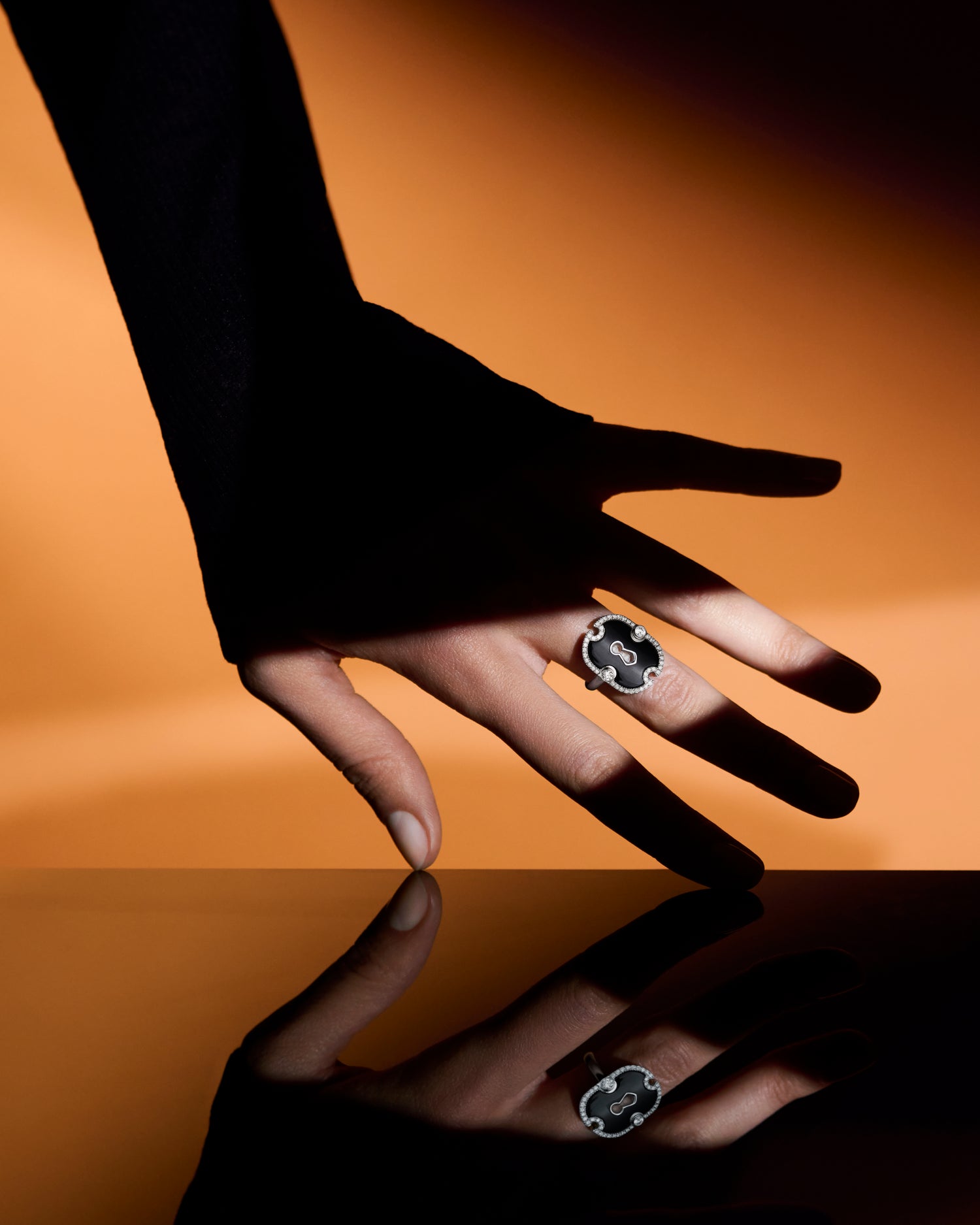Pendentif Unlock pavé, or rose 18k et nacre blanche, serti de 79 diamants pour ~0,39 carat.